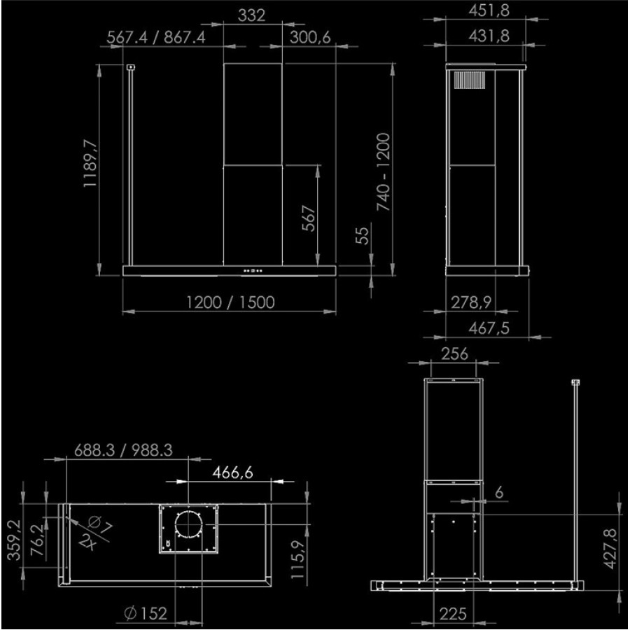 Витяжка Elea WL доступна в двох розмірах: 120 та 150 см. Це дозволяє підібрати модель, ідеально підходящу для вашої кухні. Витяжка доступна з правим або лівим розташуванням димоходу.